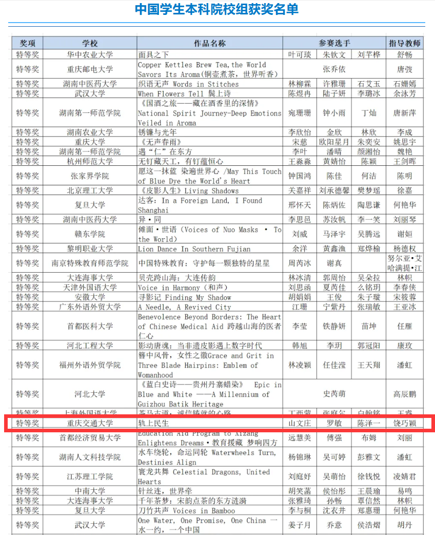 近日,第八届“外教社杯”全国高校学生跨文化能力大赛短视频大赛全国赛获奖名单公布。由我院饶巧颖老师指导,我院学生作为核心成员参与的三支团队从全国2500余个作品中脱颖而出,斩获佳绩。其中,我院2024级外国语言文学专业学生罗敏负责文稿创作的作品《轨上民生》荣获全国特等奖;2024级英语语言文学专业研究生贺兰参与创作与配音的作品《竹韵千年》,以及2024级工程翻译实验班学生李美霖、古安秀参与创作与配音的作品《永不消逝的电波》双双荣获全国一等奖。充分彰显了我院在跨文化人才培养与学生综合素质拓展方面的卓越成效。