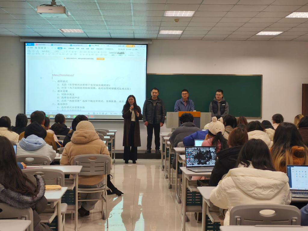 在人工智能技术深度赋能教育创新的背景下,我院英语专业持续推进“AI赋能语言学习与实践”系列教学活动。作为重庆交通大学首批“人工智能+”重点课程建设项目《英语视听说》课程建设的阶段性成果之一,12月18日晚,一场以“从AI文本到音视频创作”为主题的实践工作坊在致远楼346教室开展。英语专业2403、2404班学生参与学习,体验如何将前期已生成的英文文本进一步转化为音频与视频作品,生动实践了该课程所倡导的“技术赋能、多模态融合”教学理念。
