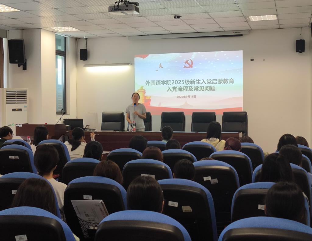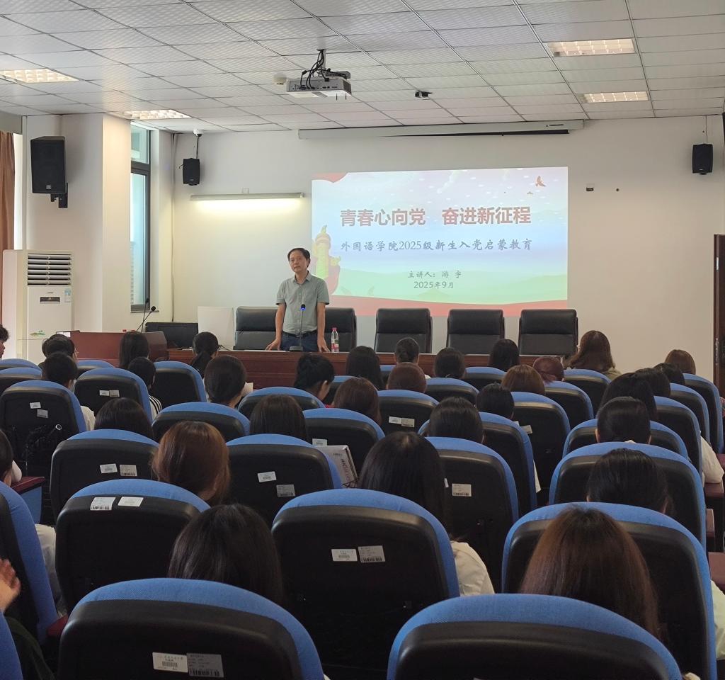 为引导青年学子坚定理想信念,积极向党组织靠拢,9月16日下午,外国语学院在科学城校区致远楼319会议室举行2025级新生入党启蒙教育专题讲座。学院正处级组织员、纪委书记游宇老师担任主讲,学生党支部书记胡媛媛老师作实务辅导。