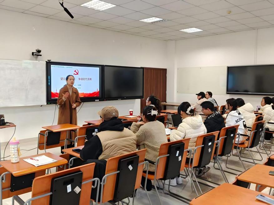 学院党委副书记文亚星作《坚定理想信念,争做时代青年》专题辅导,立足党史百年壮阔征程,紧密结合外语专业特色,通过历史维度与现实语境的对照解读,引导学员思考"如何用专业所长讲好中国故事、传递中国精神",在历史与现实的映照中校准青年责任坐标。