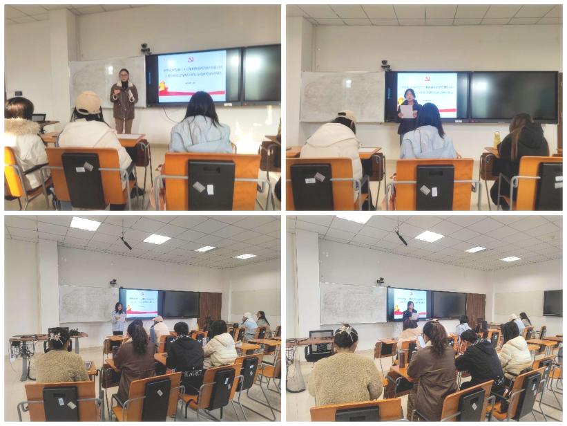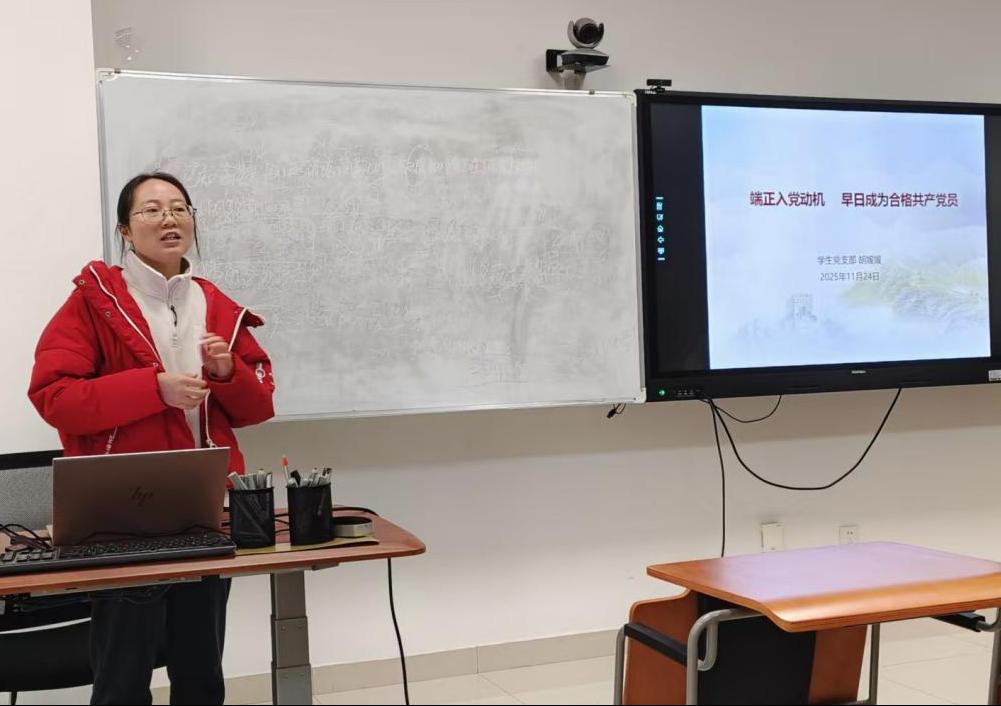 学生党支部书记胡媛媛在《端正入党动机,早日成为合格党员》分享中,直击"为何入党"这一根本问题,从内涵、必要性到实现路径层层剖析,结合"十五五"规划深入分析外语人的时代使命,引导学员摒弃功利化倾向,以国家需求为导向,在勤学笃行中淬炼党性。