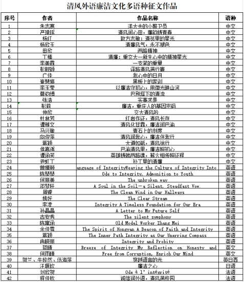为深化新时代廉洁文化教育,将清廉理念融入人才培养全过程,外国语学院2025年10-12月面向青年学生举办了“清风外语”清廉文化多语种征文比赛。本次比赛以“清风润我心,廉洁伴我行”为主题,共征集作品42份,其中中文稿件23份,多语种稿件19份。