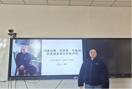 赵蕾同学汇报的主题是“布鲁姆的美国亚裔文学批评观”。该研究系统梳理了布鲁姆在美国亚裔文学批评方面的著述。布鲁姆的相关著作可分为综论与专论两类。在综论中,他构建了一个以女性作家为核心、包容性强且突出华裔色彩的经典框架,以崇高性、代表性与陌生性为核心标准;在专论中,通过重点评介、世界文学语境对比及动态补充等方式,确立黄玉雪、汤亭亭、谭恩美、卡勒德·胡赛尼为经典标杆作家。汇报指出,布鲁姆的批评实践在一定程度上弥补了《西方正典》的局限,完善了美国亚裔文学的批评体系,推动了该领域在本土乃至全球范围内的经典化进程,贡献卓著。