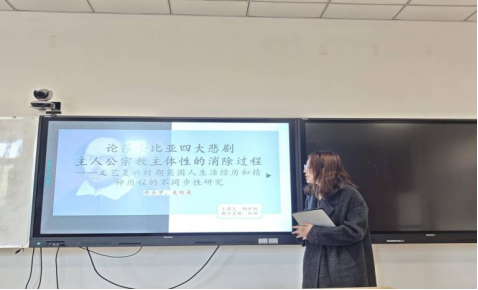 杨继悦同学围绕“莎士比亚四大悲剧主人公宗教主体性的消除过程”进行分享。该研究指出,莎士比亚的四大悲剧并非单纯的个人命运悲剧,更是特定历史转型期的精神史诗。主人公的主体性矛盾,本质上反映了封建生产方式与资本主义生产方式之间的张力在文学中的具象化呈现。借助詹姆逊理论的视角,文学作品不仅是艺术创作,更是历史进程的见证者与人类精神历程的记录者。理解这一视角,不仅能深化对莎士比亚悲剧的认知,也有助于把握社会转型与个体精神成长之间的内在关联。