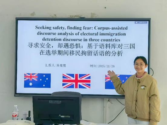 陈楚楚同学分享的主题是“寻求安全,却遇恐惧:基于语料库对三国在选举期间移民拘留话语的分析”。该研究运用语料库辅助话语分析以及批判性话语分析方法,揭示了澳大利亚的移民拘留话语转移现象及其在英国和新西兰政策中的体现。研究还指出,三个国家的政党常借助此类话语将移民塑造为“非法”或“不真实”的威胁,并通过“安全”与“人道”并存的叙事策略,为拘留与遣返等严厉措施赋予合法性。