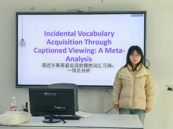 左明玉同学汇报的主题是“通过字幕观看实现的偶然词汇习得:一项元分析”。该研究聚焦两个核心问题:第一,带字幕观看视频是否比无字幕观看更有利于偶然词汇习得;第二,哪些因素可能调节该效应。研究表明,字幕观看对二语学习者的偶然词汇习得具有中等程度的正向促进作用。进一步通过调节变量分析发现,该方法尤其对小学生群体及中级水平学习者效果最为显著。这些发现不仅为二语词汇教学提供了实证依据,也为教育实践带来了具体启示。