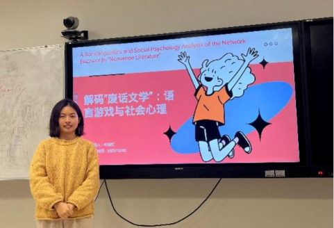 邓媛媛同学以“社会语言学视域中的网络热词发展路径研究——以2022—2024年网络热词为例”为题进行汇报。该研究通过构建“语言构成-特征分析-成因与规范”的研究框架,探讨了2022—2024年网络热词的发展路径,并倡导理性对待、多方协同规范网络热词的观点,从而为理解网络语言现象、推动语言学研究与社会语言规范提供了社会语言学新视角。