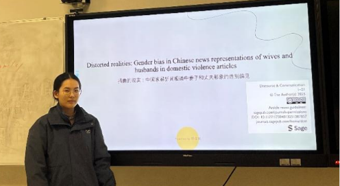 陈佳慧同学聚焦“中国家暴新闻报道中妻子和丈夫形象的性别偏见”进行主题汇报。该研究创新性地融合语料库语言学与批评话语分析,通过对上千万字新闻文本的系统考察,首次大规模揭示了中文媒体在报道家庭暴力时存在的四种系统性偏见框架。该研究不仅深化了社会语言学关于语言、权力与意识形态关系的理论探讨,也对推动媒体伦理建设、司法实践改善及社会性别平等意识提升具有重要的现实启示,为理解当代中国公共话语中的性别政治提供了扎实的实证基础与批判视角。