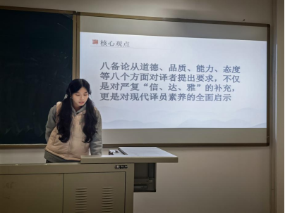 谭紫怡围绕“从彦琮‘八备’论看当今译员应具备的素养”进行主题汇报,系统阐述了隋代佛经翻译家彦琮提出的“八备”理论对现代译员在道德、语言与专业态度方面的启示。她分析指出,当前相关研究仍存在理论深度不足、与现代翻译实践结合较弱、研究方法传统等局限,未来可拓展中西译论比较及现代译员实证研究,从而激活传统理论的当代价值,为译员素养培养提供了本土化参照。
