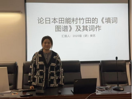 樊艺同学围绕《田能村竹田〈填词图谱〉及其词作》进行汇报。田能村竹田是日本江户时代著名南画家,被誉为日本“词学大宗师”。面对词学在日本的衰微局面,他以中国词学为根基,编撰日本首部填词专著《填词图谱》,作品以中国词律为骨、日本意趣为韵,著作更传回中国刊印,实现词学反向传播,展现了江户文人对中华文化的深度吸收与创新能力。
