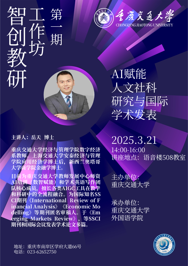 “智创教研工作坊”第1期预告——岳天教授 AI赋能人文社科研究与国际学术发表