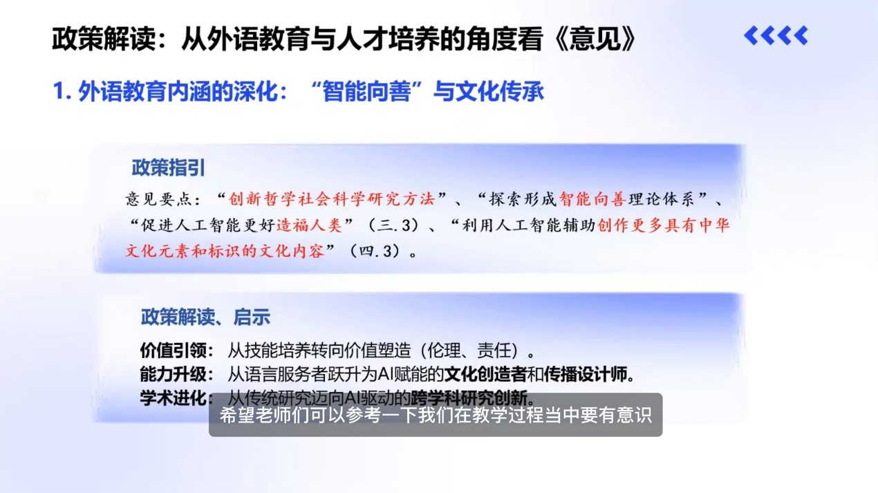 外语教育教学要立足“人工智能+全球合作”要求,加强国际AI治理规则、技术标准的教学研究,发挥外语优势推动AI技术普惠共享,深化相关领域国际合作与人才联合培养。