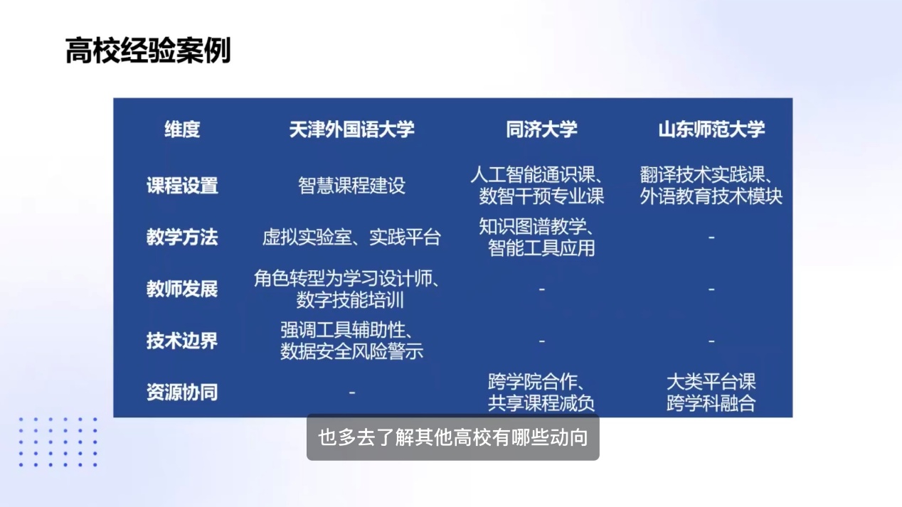 同济大学通过跨学院合作共享课程资源减轻教学负担,山东师范大学依托大类平台课推动跨学科融合,天津外国语大学则强调“工具辅助性”与“数据安全风险警示”,为技术应用划定边界。