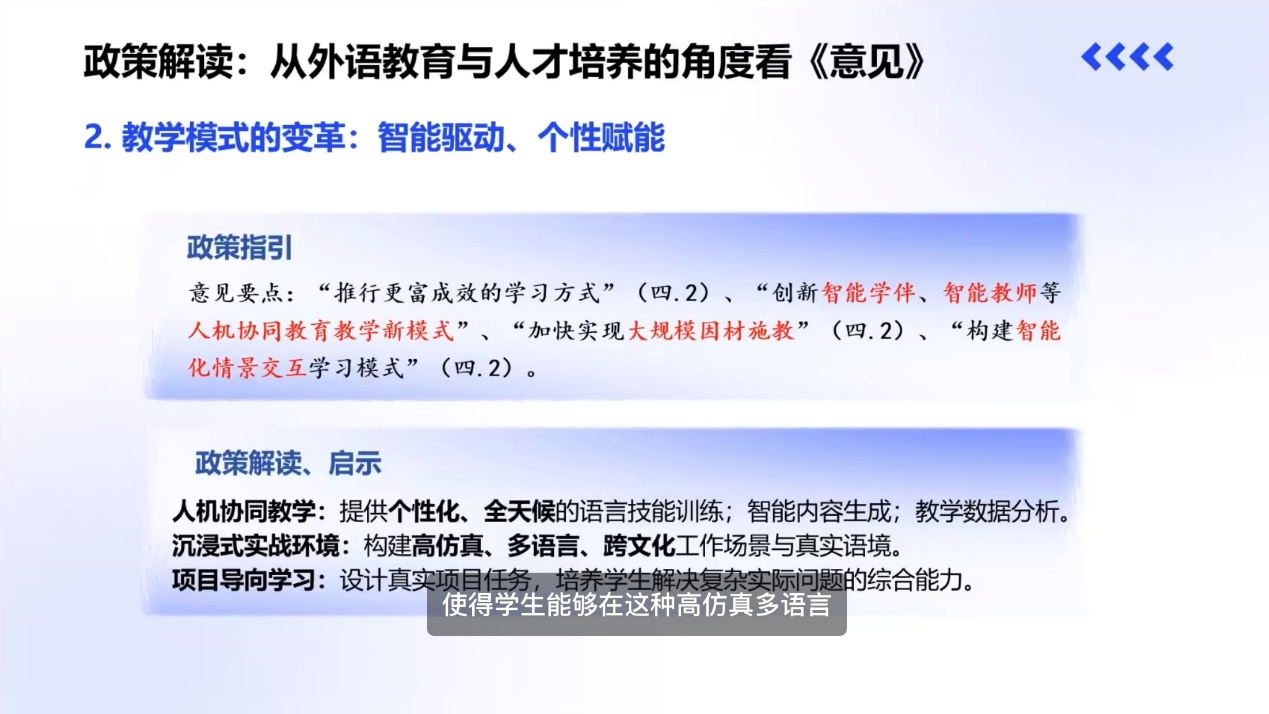 需探索“智能学伴+智能教师”的人机协同教学模式,借助智能化情景交互构建高仿真跨文化语境,以项目导向学习培养学生在外语学习过程中解决实际问题的综合能力,实现规模化的因材施教。